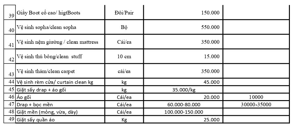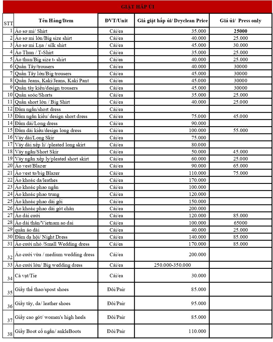 Và dưới đây là bảng giá đang được áp dụng tại HT Laundry gởi đến Quý khách hàng:
